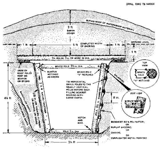 1980 pamphlet shows the design of an underground shelter offering protection against radioactive fallout, nuclear blast, and tornados.